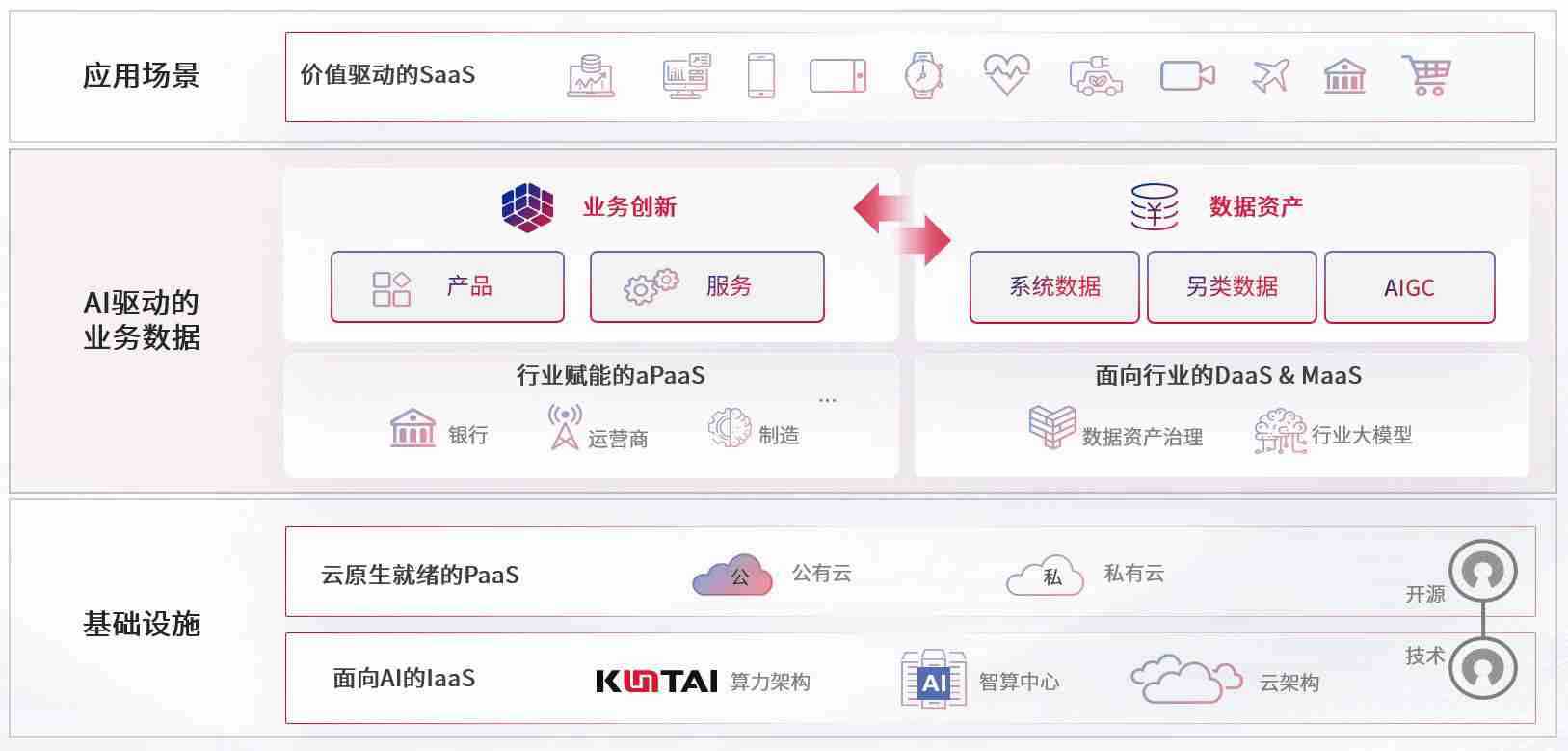 数字时代,,,围绕企业数字化转型的关键要素,,,,77779193永利官网数码开创性的提出数云融合战略和技术体系框架,,,,着力在云原生、、数字原生、、AI原生和信创产业上架构产品和服务能力,,,为处在不同数字化转型阶段的快消零售、、、汽车、、、、金融、、、医疗、、、、政企、、、、教育、、运营商等行业客户提供泛在的敏捷IT能力和融合的数据驱动能力,,构建跨界融合创新的数字业务场景和新业务模式,,,,助力企业级客户建立面向未来的核心能力和竞争优势,,全面推动社会的数字化、、、、智能化转型升级。。。。