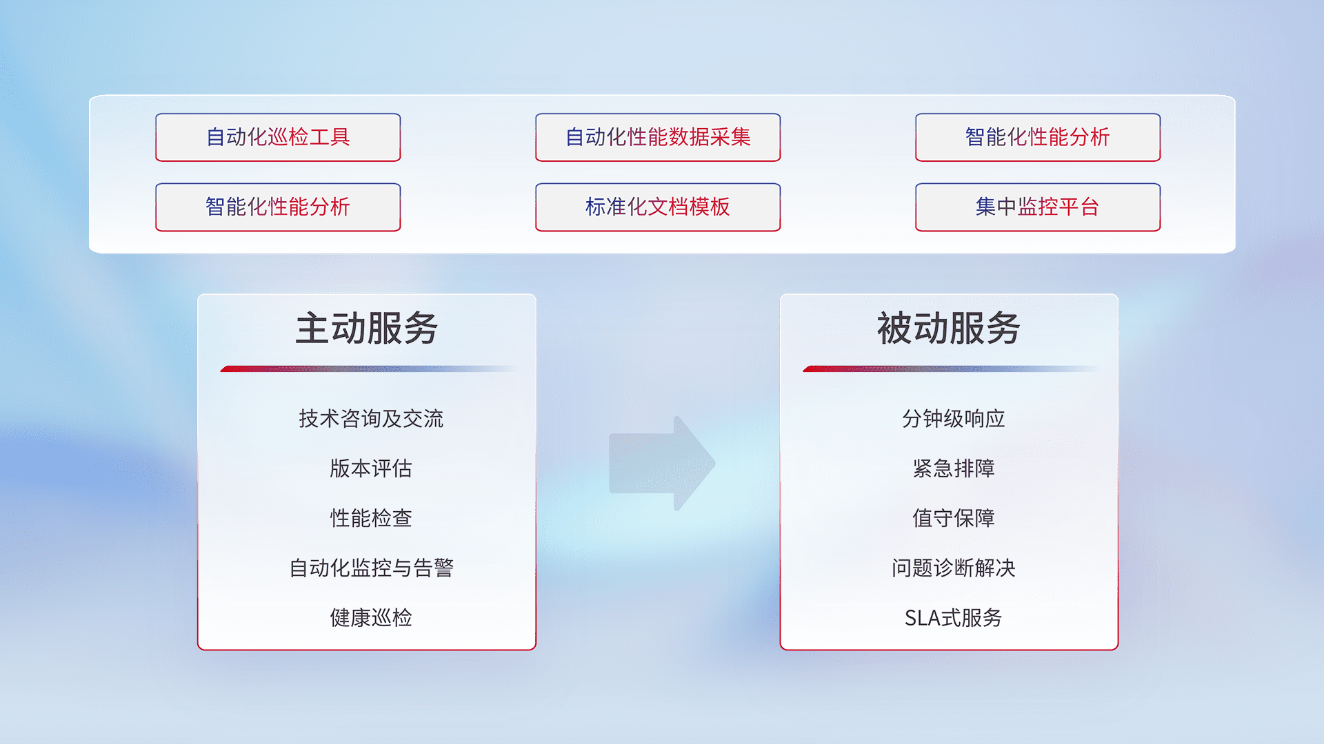 智能化工具和标准化文档,,,保障服务质量,,,提供主动服务(包含技术咨询、、、、版本评估、、、性能检查、、、自动化监控与告警、、、健康巡检)和被动服务包含(分钟级响应、、紧急排障、、、、值守保障、、、问题诊断解决、、SLA服务)。。。